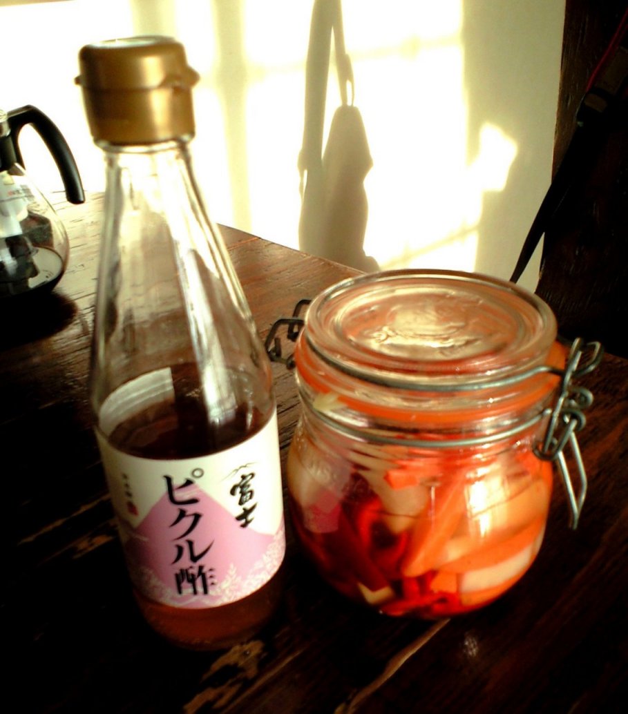 少し干した野菜(干さなくてもいい)をこの酢に漬ければいいだけだもん。