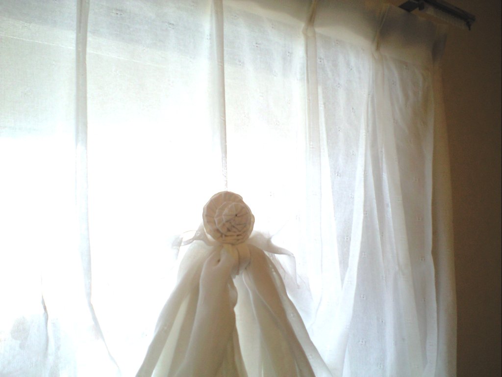 ←逆光でわかりにくい写真ですが(画像をクリックすると大きくなるよ)、またヨーヨーキルトを使って・・・え、え~と、つまりですね、レースのカーテンに「ヨーヨーキルト+リボン」を取り付け、ガーテンを持ちあげつつ裏側に付けた大きめのボタンに引っかける・・・という仕組みです。カーテンを左右に開けるだけでなく、下半分を開けるという状態にしたかったわけなのです。