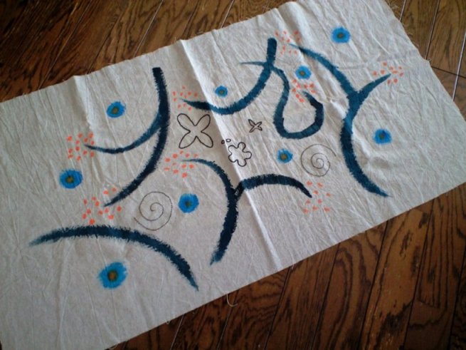 私は、アクリル絵具で絵を描いた布に刺繍をチクチク。